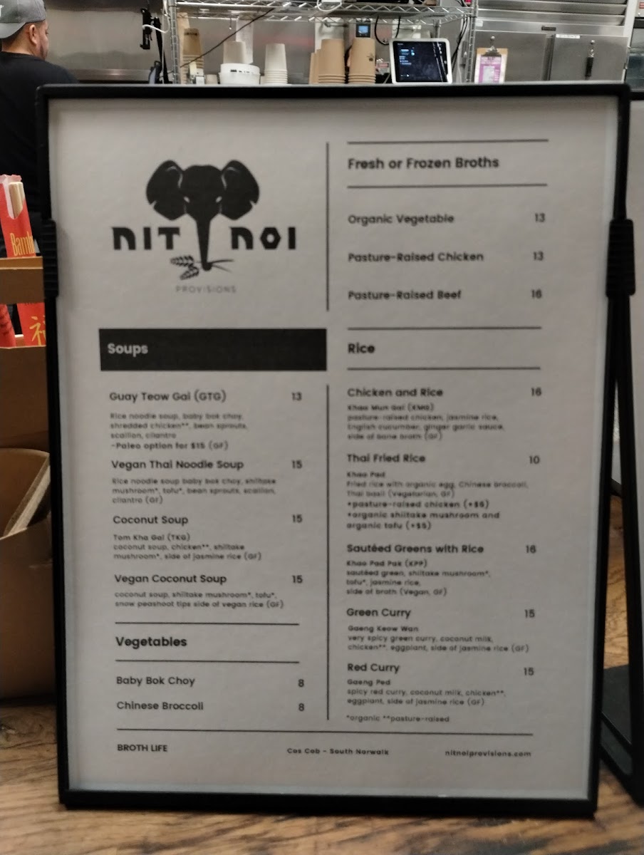 Your choice of 3 delicious broths: ✨ Restore - Nit Noi chicken or organic vegetable broth, topped with scallion, cilantro, fried garlic, chili vinegar, and Thai chili ✨ Defense - Nit Noi organic vegetable broth, poached ginger, pickled ginger, f...