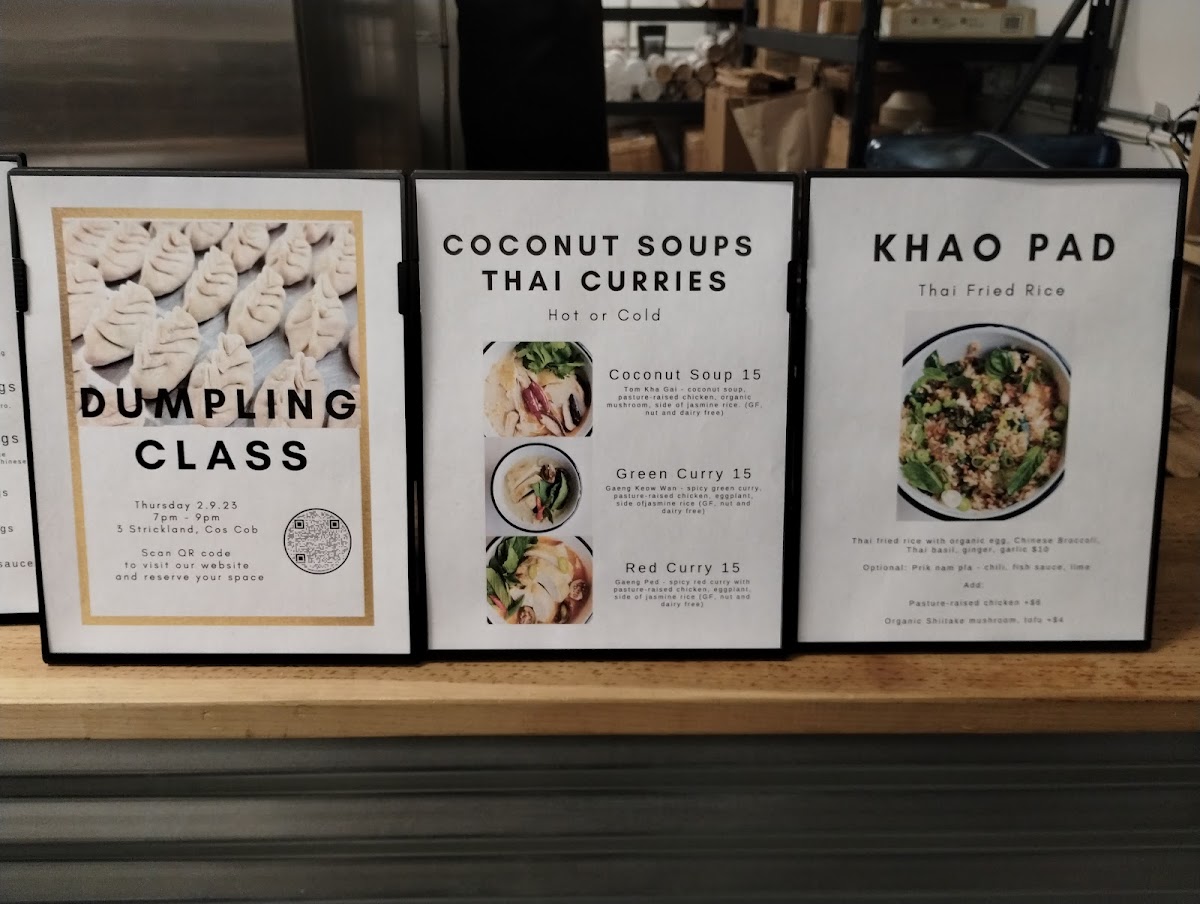 5 hand folded dumplings dumplings, nit noi soy chili sauce and a side of broth. Pork dumplings: seasoned ground pork, organic egg yolk, ginger, and garlic.